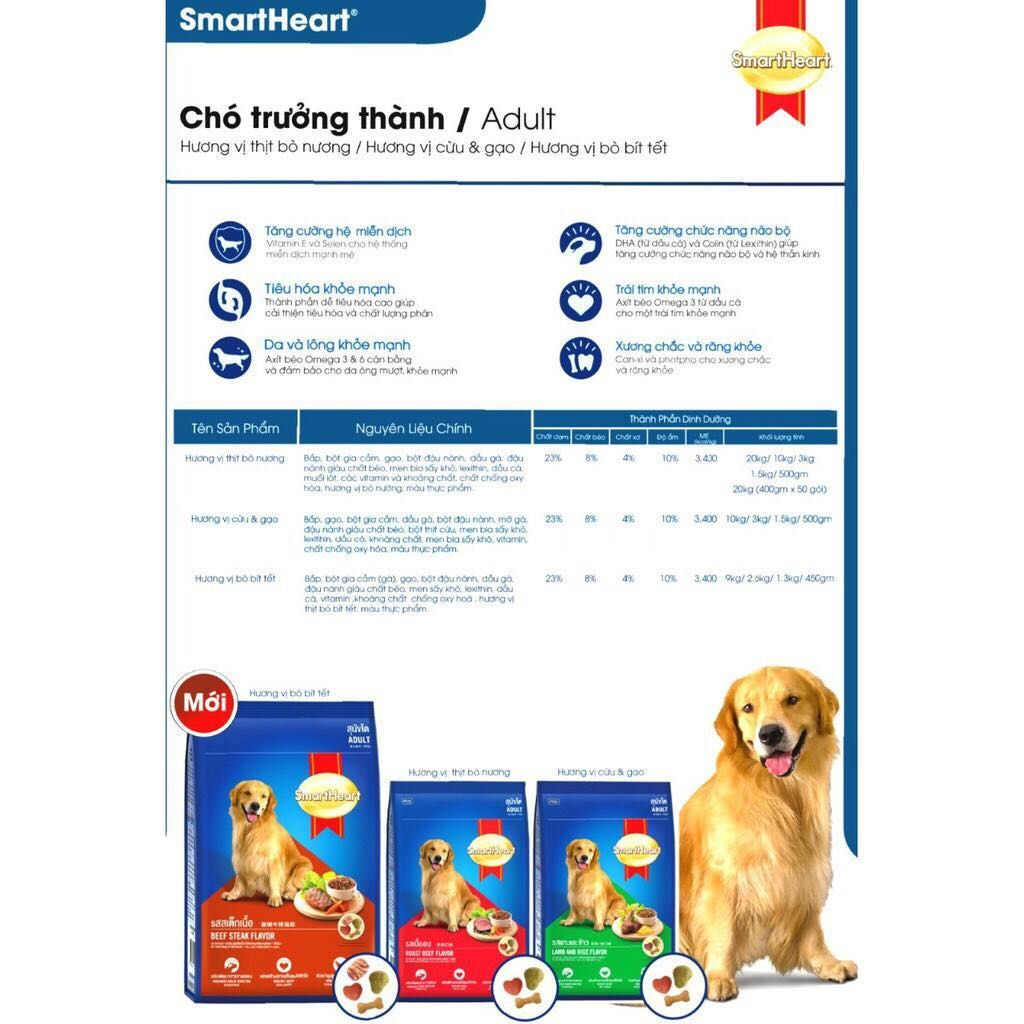 Thông Tin Dinh Dưỡng Thức Ăn Cho Chó Hạt Smartheart Adult 20Kg Vị Bò