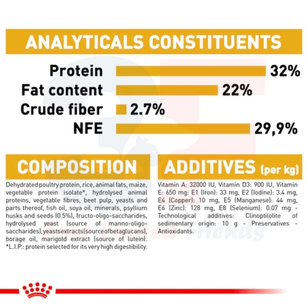Protein gia cầm, gạo, chất béo động vật, bắp, protein thực vật*, protein động vật, xơ thực vật, củ cải đường, men, dầu cái, dầu cá, dầu đậu nành, khoáng chất, psyllium (0,5%), fructo-oligo-sacarit, men thủy phân (nguồn manno-oligo-sacarit), chiết xuất men (nguồn betaglucan), dầu borage, chiết xuất cúc vạn thọ (nguồn lutein).