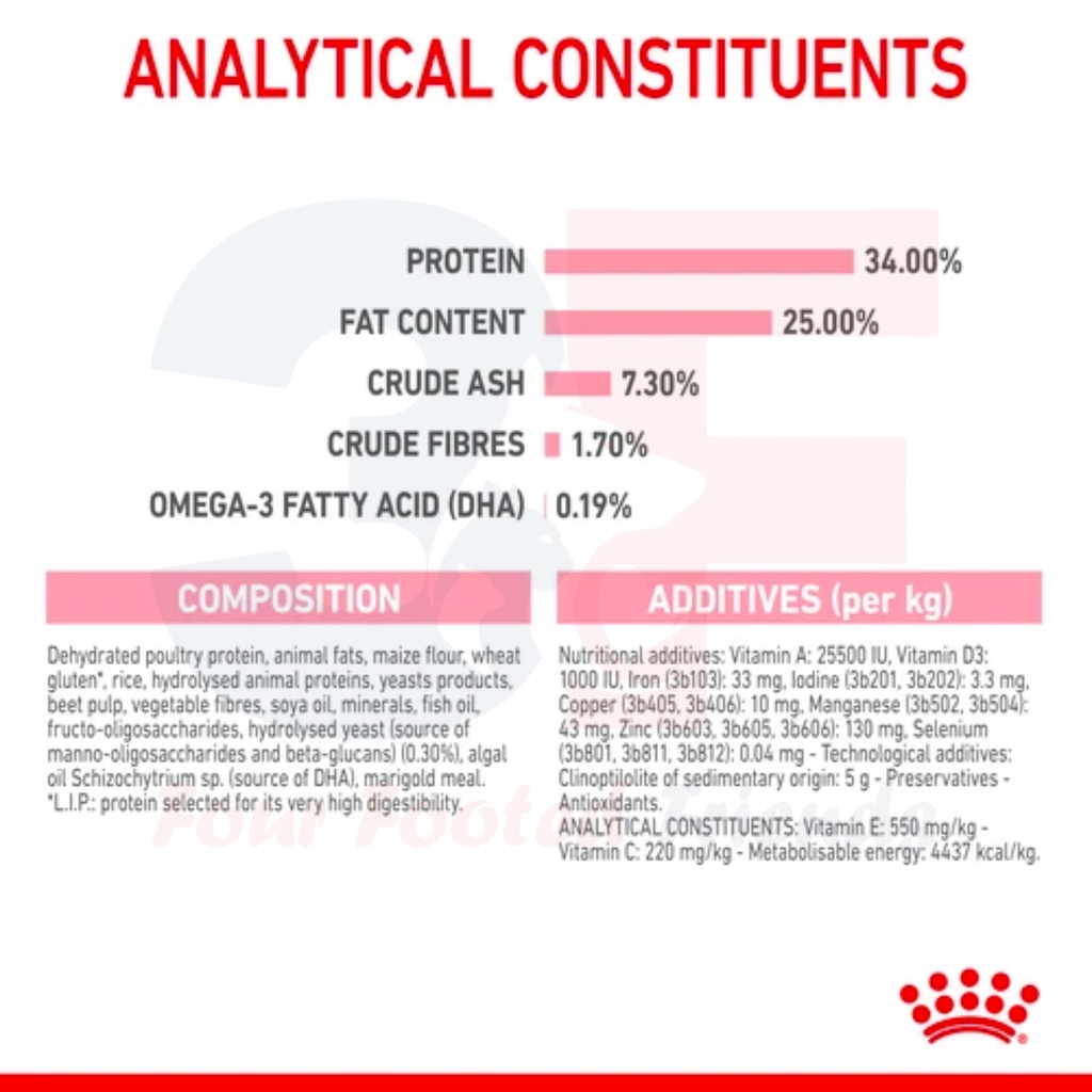 Protein gia cầm, chất béo động vật, bột bắp, gạo, protein thực vật*, protein động vật, men, dầu cá, củ cải đường, xơ thực vật, dầu đậu nành, khoáng chất, fructo-oligo-sacarit (0,35%), men thủy phân (nguồn manno-oligo-sacarit), chiết xuất men (nguồn betaglucan), chiết xuất cúc vạn thọ (nguồn lutein).