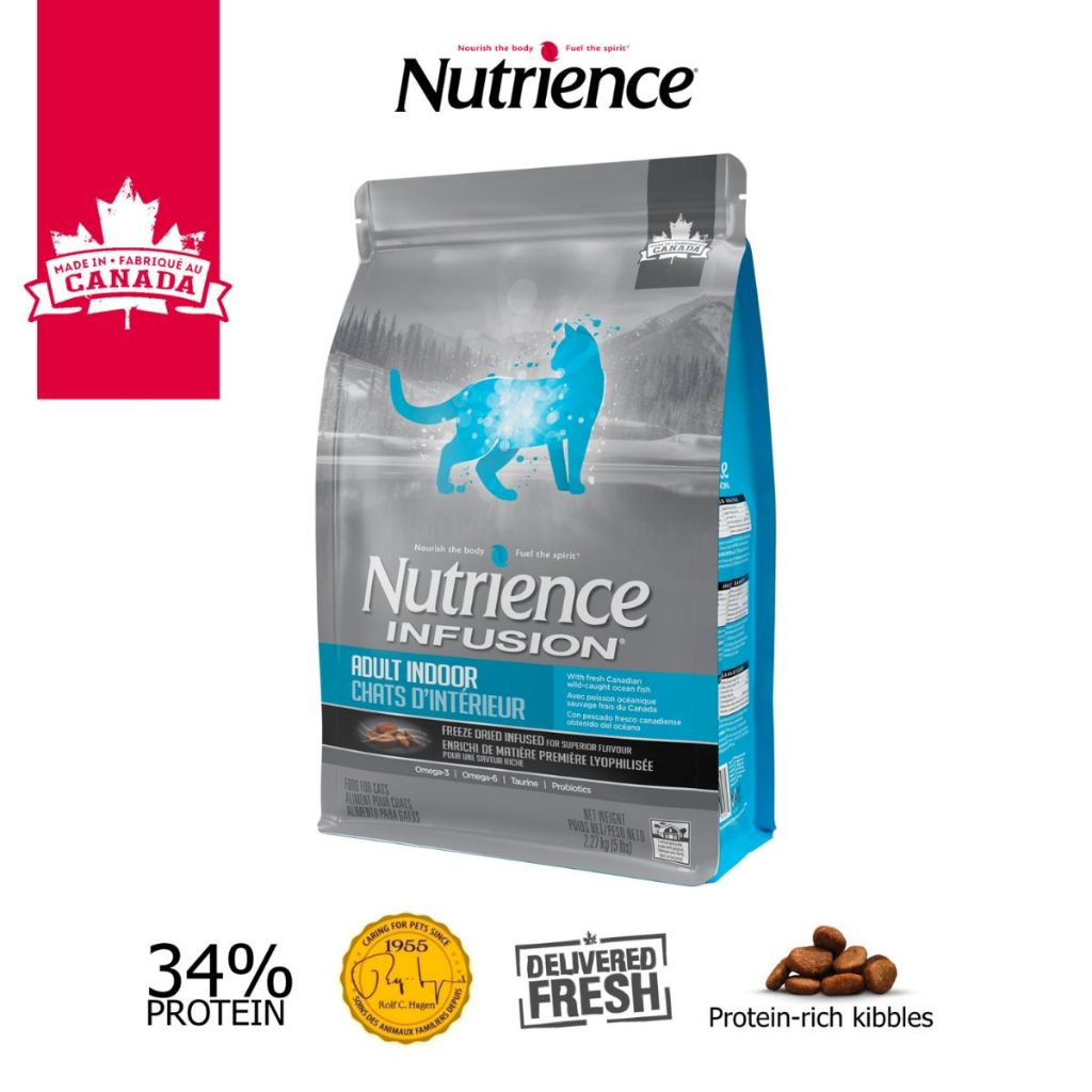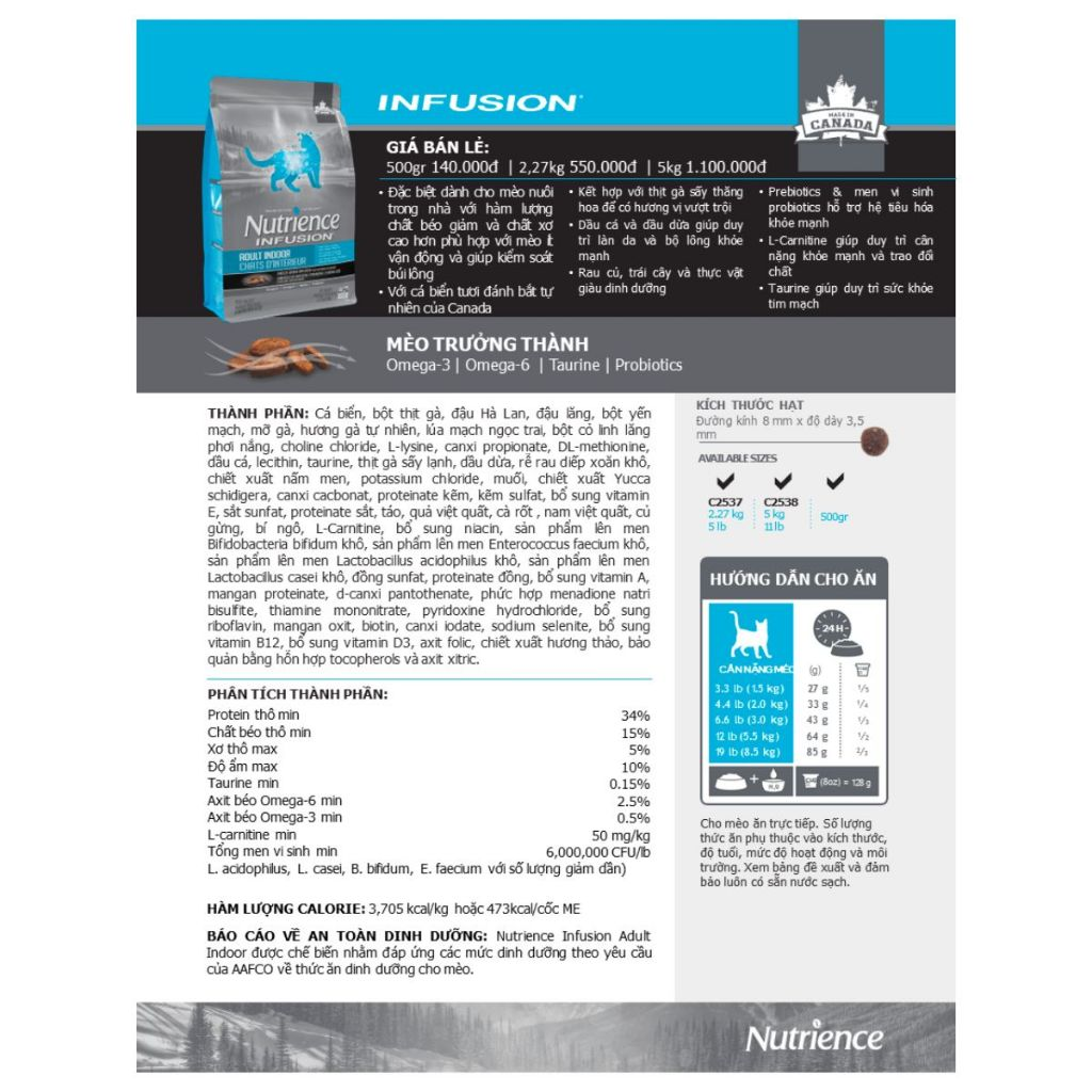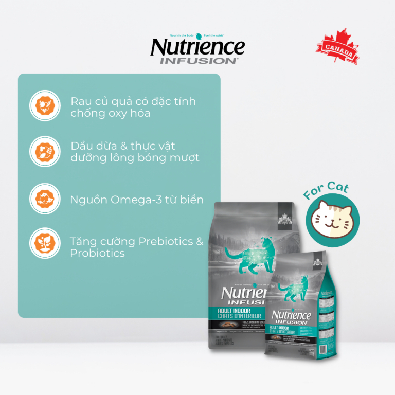 Nutrience Infusion Adult Indoor cho mèo trưởng thành – thịt gà và rau củ trái cây tự nhiên là thức ăn cho mèo do Canada sản xuất riêng dành cho mèo trong nhà, sản phẩm là sự kết hợp từ thịt gà tươi, không bao giờ đông lạnh, ngũ cốc nguyên hạt có hàm lượng đường huyết thấp, rau, trái cây và các loại thực vật giàu chất dinh dưỡng hỗ trợ tiêu búi lông, hệ tiêu hóa, hệ miễn dịch… Sản phẩm mang đến sức khỏe toàn diện cho mèo.