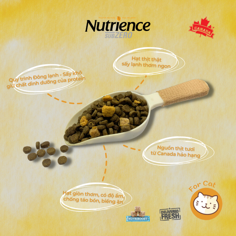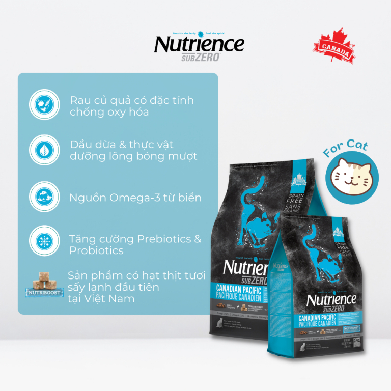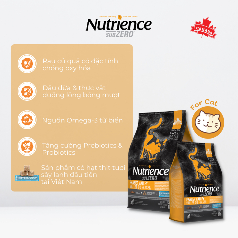 Sản phẩm Nutrience Subzero Fraser Valley cho Mèo sử dụng các nguồn nguyên liệu tự nhiên tươi sống của Canada như thịt gà tây, thịt gà cao cấp Canada, heo rừng, cá biển đại dương và hạt thịt gà tươi sấy lạnh để cho ra hương vị tuyệt hảo có thể khiến cho những chú mèo cưng khó tính nhất cũng phải thèm ăn.
