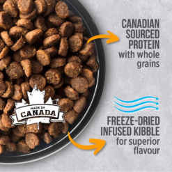 Thịt gà rút xương, bột gà, yến mạch cắt nhỏ, lúa mạch ngọc trai, đậu Hà lan, đậu lăng đỏ, mỡ gà (được bảo quản bằng tocopherols hỗn hợp), hương vị gà tự nhiên, bột cỏ linh lăng phơi nắng, gan gà sấy lạnh, dầu cá hồi, dầu dừa, canxi cacbonat, bí ngô, bí nghệ, cà rốt, rau bina, bông cải xanh, táo, quả việt quất, nam việt quất, lựu, chiết xuất quả bách xù, gừng, thì là, hoa cúc, lá bạc hà, rễ cam thảo, nghệ.