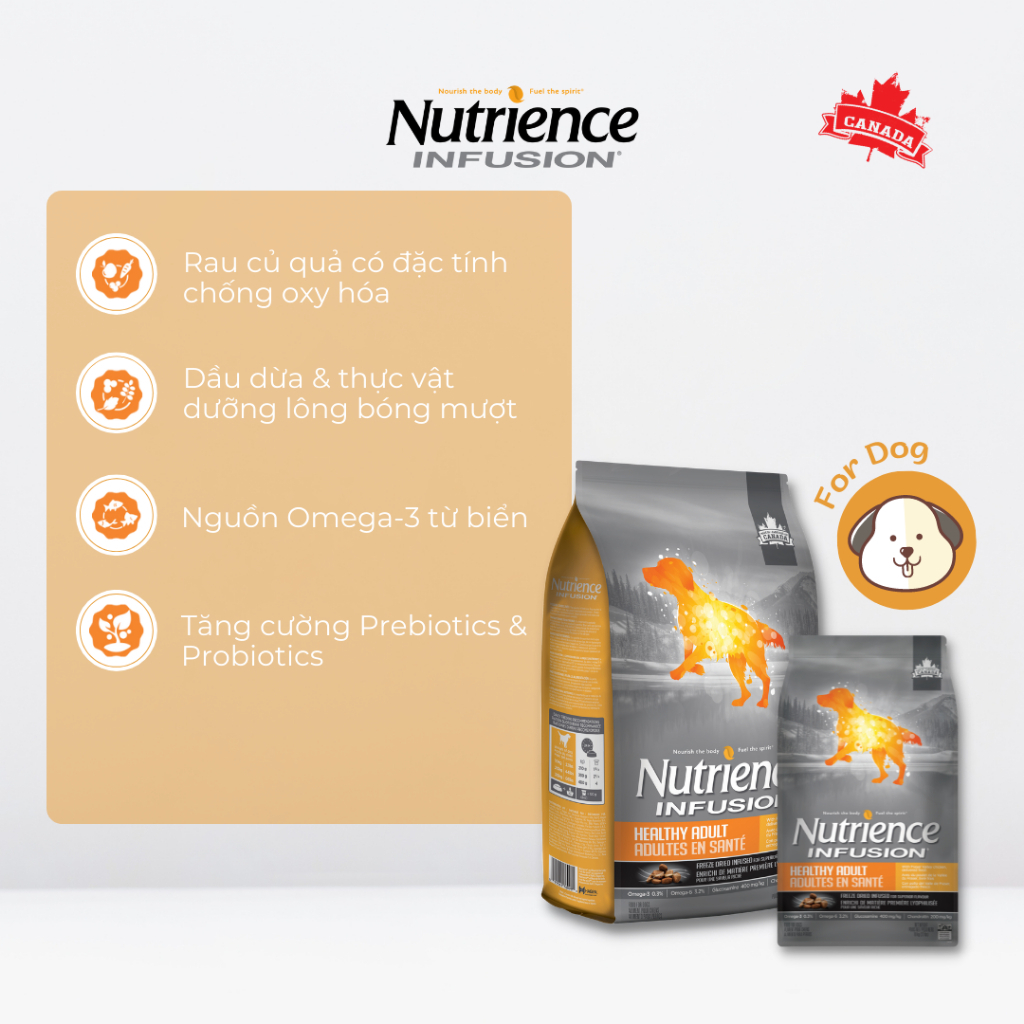 Nutrience Infusion Healthy Adult là thức ăn dành cho chó kích thước trung bình và lớn trưởng thành như Corgi, Border Colie, Dobermann, Labrador, Golden, Pit Bull, French bulldog, Beagle, German Shepherd, English Bulldog, … được sản xuất tại Canada, kết hợp thịt gà tươi, không bao giờ đông lạnh, ngũ cốc nguyên hạt có hàm lượng đường huyết thấp, rau, trái cây và các loại thực vật giàu chất dinh dưỡng.