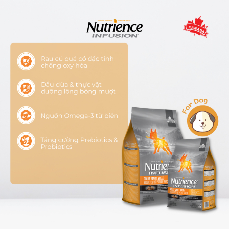 Nutrience Infusion Adult Small Breed là thức ăn cho chó do Canada sản xuất dành cho chó giống nhỏ, kết hợp thịt gà tươi, không bao giờ đông lạnh, ngũ cốc nguyên hạt có hàm lượng đường huyết thấp, rau, trái cây và thực vật giàu chất dinh dưỡng. Sản phẩm có mùi vị thơm ngon dành cho chó kén ăn.