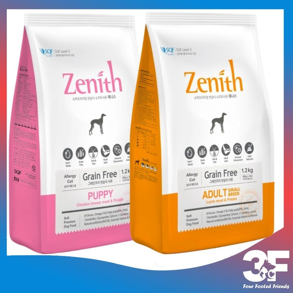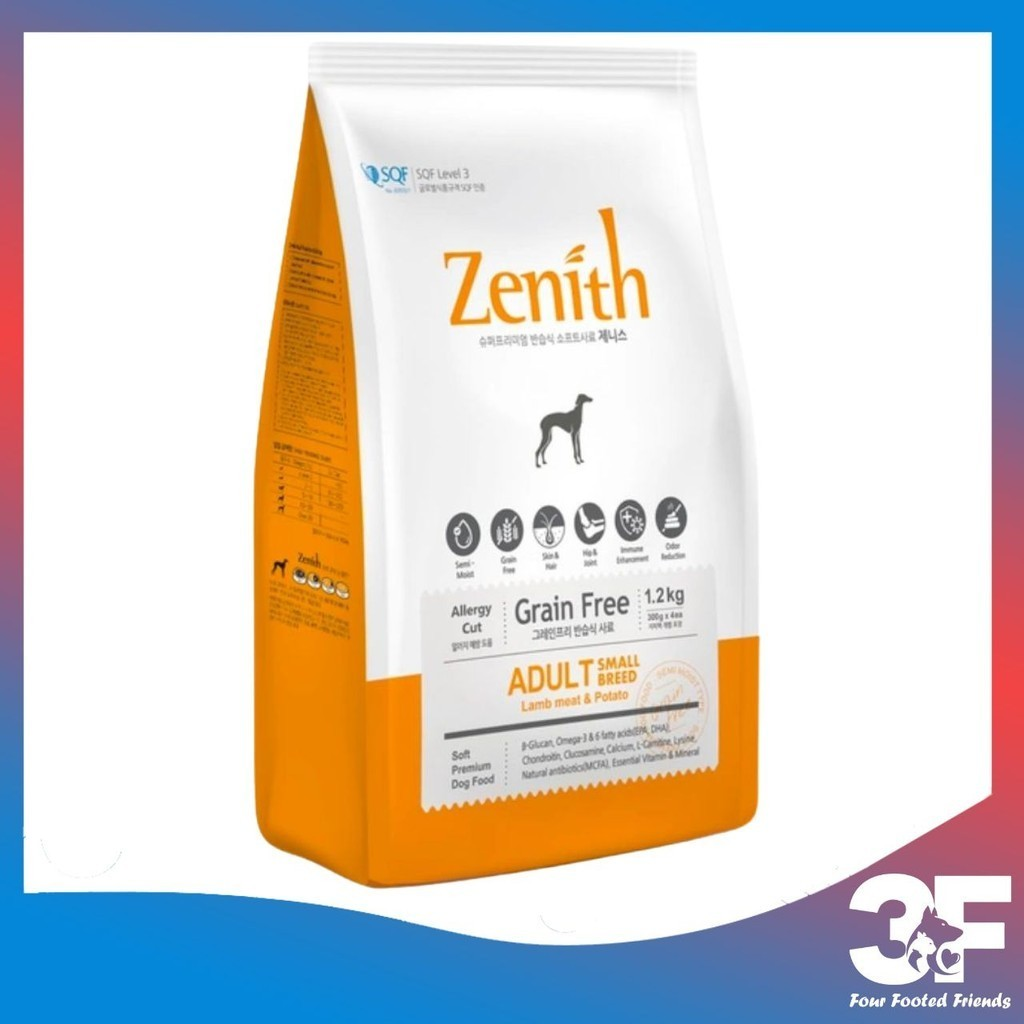 Chiết xuất từ cây ngọc giá giúp giảm bớt mùi phân ở các chú chó. Lượng calo cao và ít mỡ của thịt cừu tươi rất tốt cho hệ tim mạch. Gạo lứt làm giảm cholesterol, bảo vệ hệ tim mạch, cải thiện chức năng gan, giúp cơ thể đào thải những chất độc có hại. Zenith được chế biến dưới dạng hạt mềm, độ ẩm cao hơn thức ăn hạt khô thông thường, lượng muối thấp, rất dễ nhai và dễ tiêu hóa.